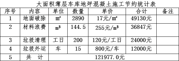 根据以往项目的车库地坪施工及应用本工法施工的项目地坪统计,应用本工法的混凝土地坪一次成优率从原来的86.3%提高到95%。本工程1标段,车库地面地坪9000平方米,本工程2标段,车库地面地坪18000平方米,本工程1标段6230平方米应用的施工为例计算经济效益,应用本工法可以避免共5cm厚2890㎡的地坪返工,节约的费用如下表: