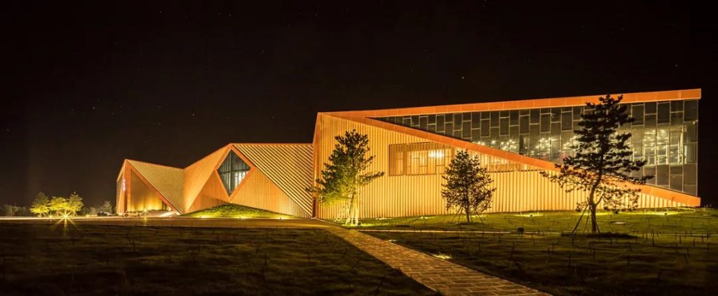 立面上通过三道巨型开窗连通了室内外空间,就像屋顶的景观平台,游客从这里可以获得360度的景观体验,葡萄园区、贺兰山脉以及宁夏陵墓均尽收眼底。