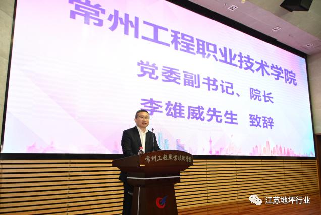 4月8日上午,由常州工程职业技术学院、江苏省地坪行业协会联合举办的“地坪产业学院成立仪式”在学校学术报告厅举行。学校党委副书记、校长李雄威、中国建筑材料联合会地坪产业分会秘书长刘元新、常州科教城管委会副主任蒋鹏举、住建部武进绿色建筑集聚区管委会主任贺军、常州市建筑业协会秘书长朱俊毅、中国建筑装饰协会地坪分会会长庄建平、以及来自全国十五个省、直辖市地坪协会的会长和93家协会成员单位,共计170余人参加了此次盛会。仪式由学校党委委员、副校长潘玉琴主持。