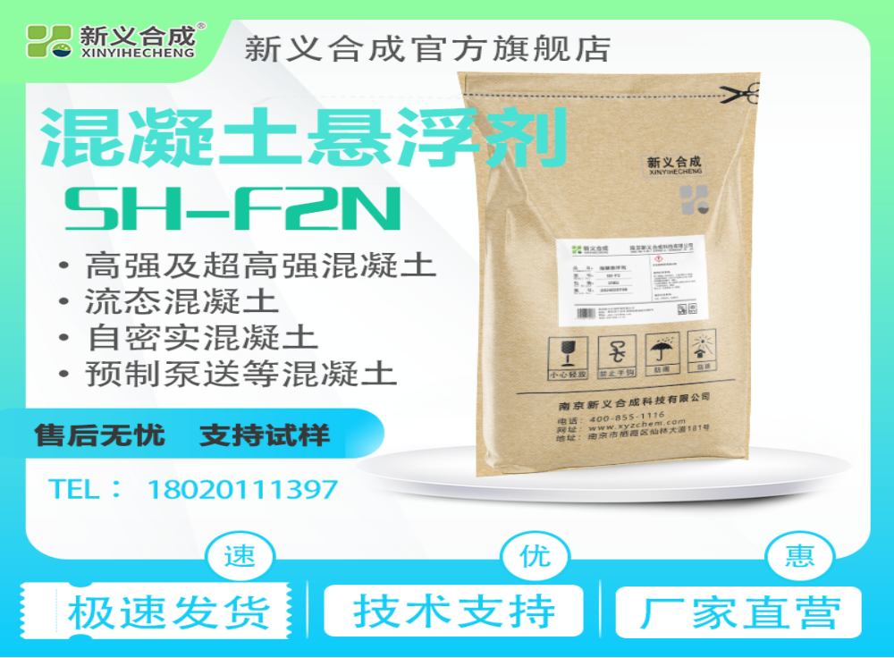 SH-F2N 是一款高分子聚合物,经高塔喷雾制成的新型悬浮剂。可保证混凝土具有高流动度的同时整体性好、砂石分布均匀,与聚羧酸搭配使用可有效提供泵送效率。