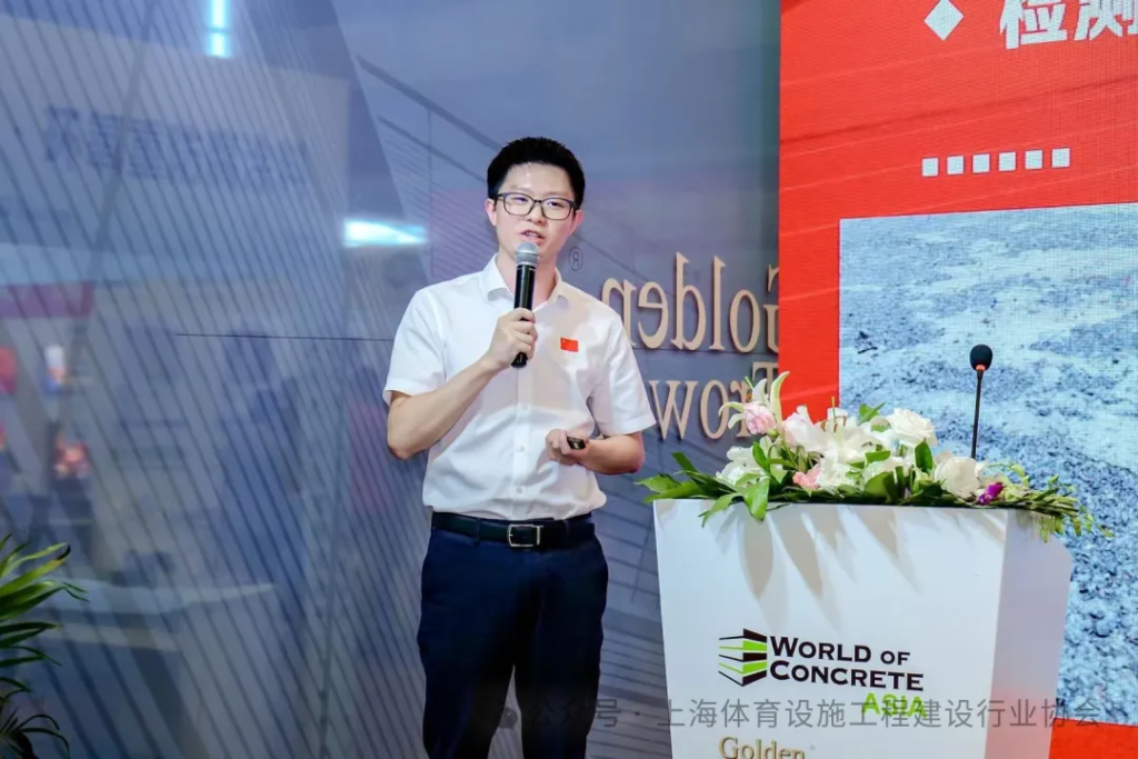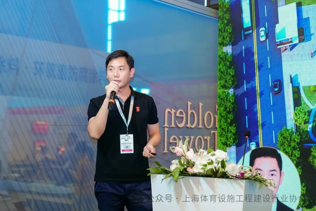 上海建科检验有限公司化学分析测试中心主任顾嘉赟以《新国标关键技术应用案例分享》为题,进行了专业阐释;他从新国标背景、环保性能关键技术应用、田径及篮球场地关键技术应用、人造草坪足球场地关键技术应用、标准执行措施建议五大方面展开介绍。