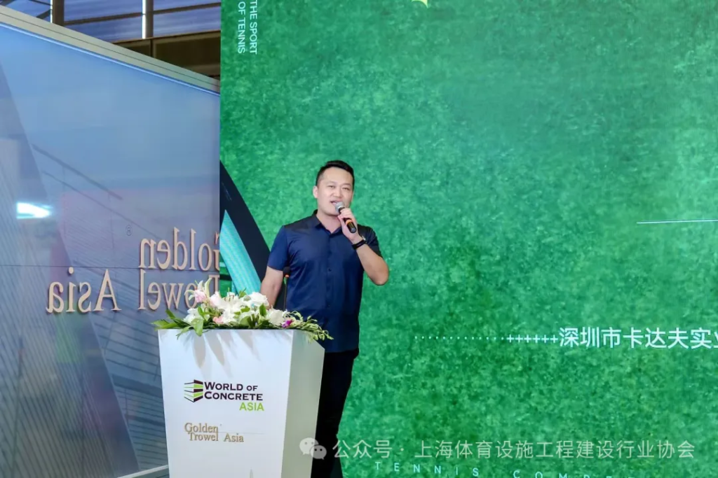会上,深圳市卡达夫实业有限公司总经理王擎介绍了网球运动简史、中国网球场发展、国内外网球发展现状,同时对网球场地地面材质,包括最悠久、最具传统意味的草地场,属于软性场地、有较大的摩擦红土场,以及最常见的丙烯酸场地进行了分析,且列举了相关代表性赛事的应用。