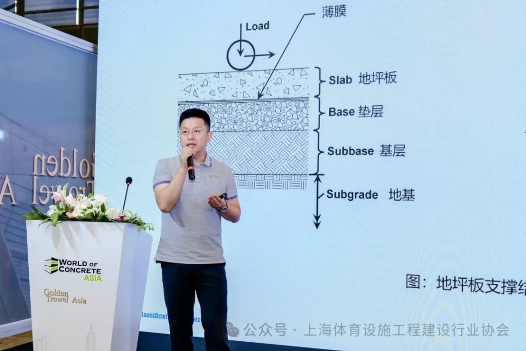 玉田县致泰钢纤维制造有限公司总经理陈相宇分析了混凝土工业地坪的发展趋势。他讲到国内地坪系统的设计现状、地基设计的相关规范、国内外基层设计的不同点,以及回弹地基和弹性地基的区别,地基处理的方式和注意事项。
