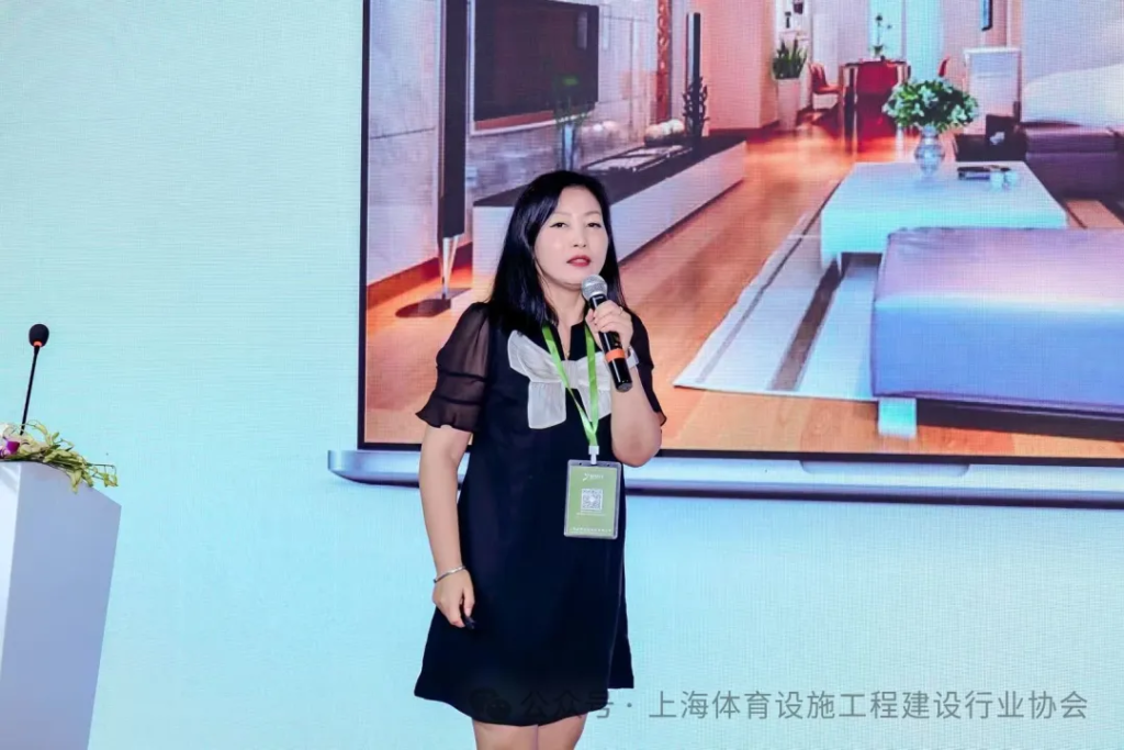 山东世纪联合新材料科技有限公司总经理路玲,首先介绍了塑胶产品的创新升级以及看台防水+装饰的解决方案。包括塑胶产品创新升级之硅PU自清洁面漆,塑胶产品创新升级之可上车的球场GTPU等。路总表示,要让跑道打破红绿界限,让跑道和EPDM颗粒场地实现颜色自由。此外,对于看台表面爆皮、脱层、开裂起壳、空鼓、防水效果差的痛点,她也进行了分析。最后她还作了建筑物屋顶、墙面防水解决方案、外墙装饰,学校室内空间体系翻新等相关内容的分享。